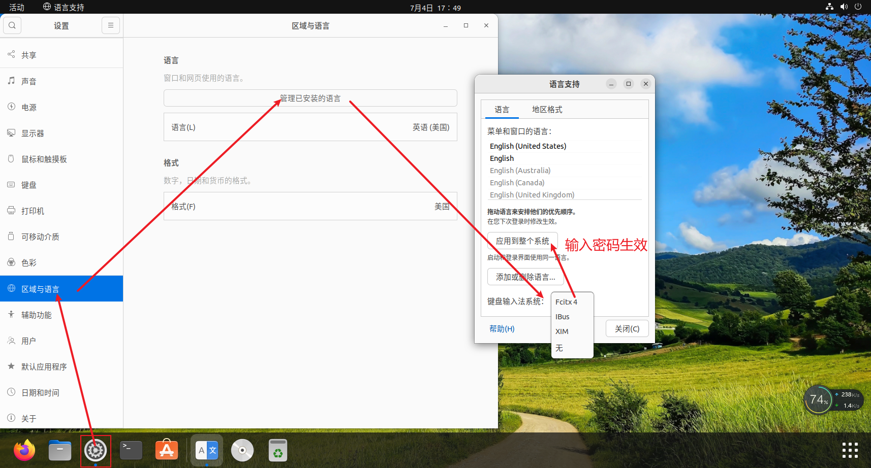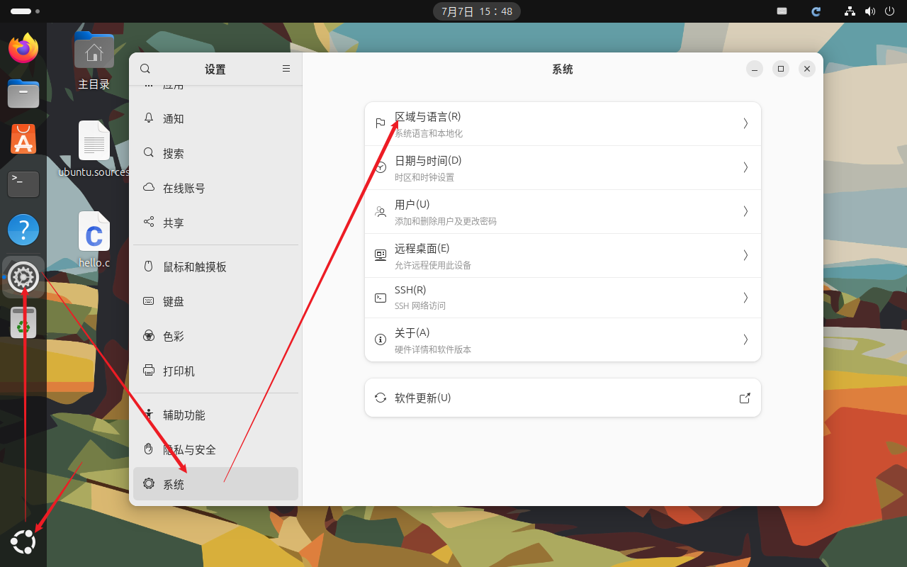 打开Ubuntu的设置 --> 选择区域与语言