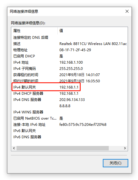 网关地址根据各个局域网的配置不同而有所改变,不能照抄上述地址,网关地址一般而言就是当前局域网的路由器的地址,可以从宿主机windows的网络配置化中查看: