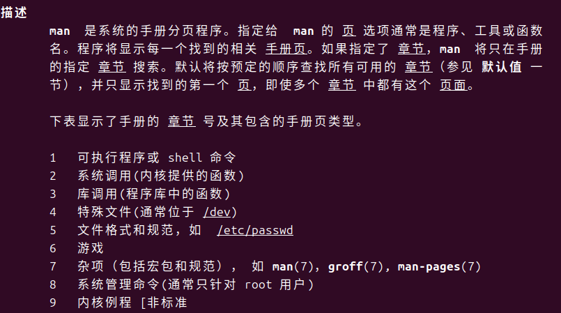 注意:man手册总共有9册,Ubuntu默认只安装了1册,其余的需要手工安装,指令如下: